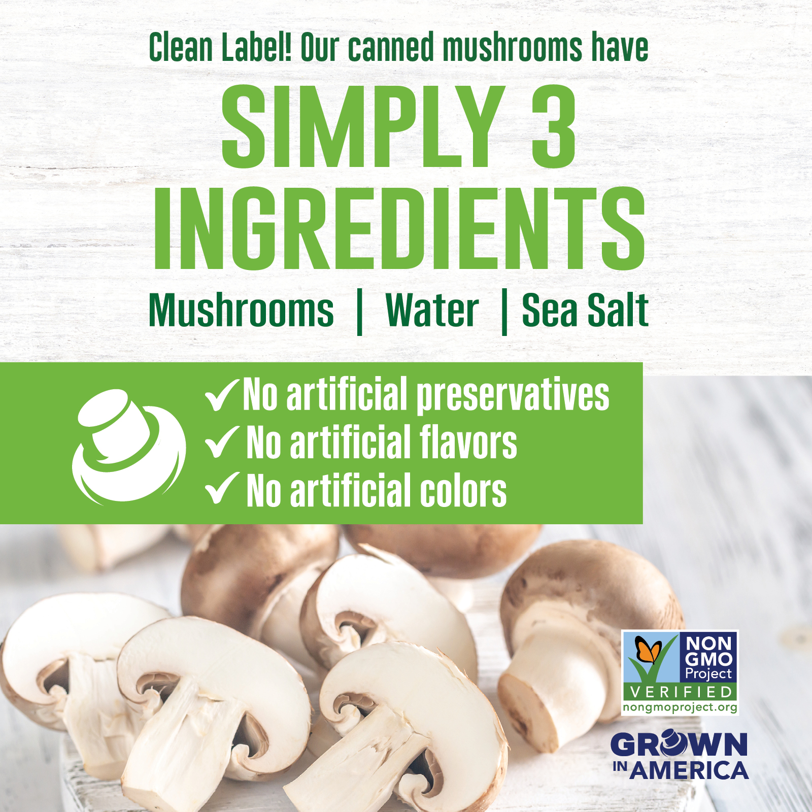 Exciting news! We've revamped our canned mushrooms to have just simply 3 ingredients – mushrooms, water & sea salt. That's it! Still the same great flavor & quality you've come to love, only now with simple, clean ingredients with no artificial preservatives, flavors or colors!